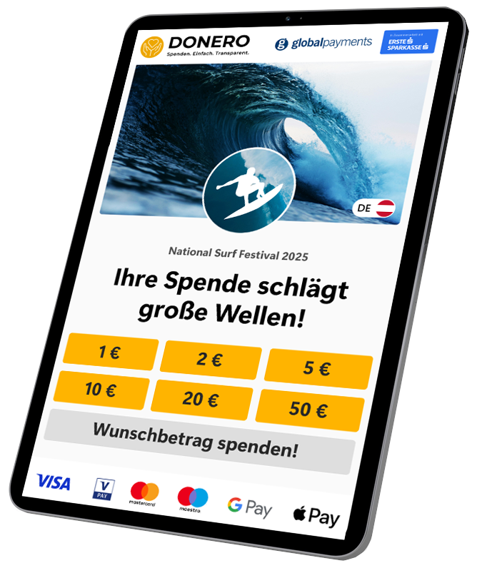 Mit Donero spenden Unterstützer:innen in wenigen Sekunden kontaktlos per Debit- oder Kreditkarte – modern, unkompliziert und ganz ohne Bargeld.